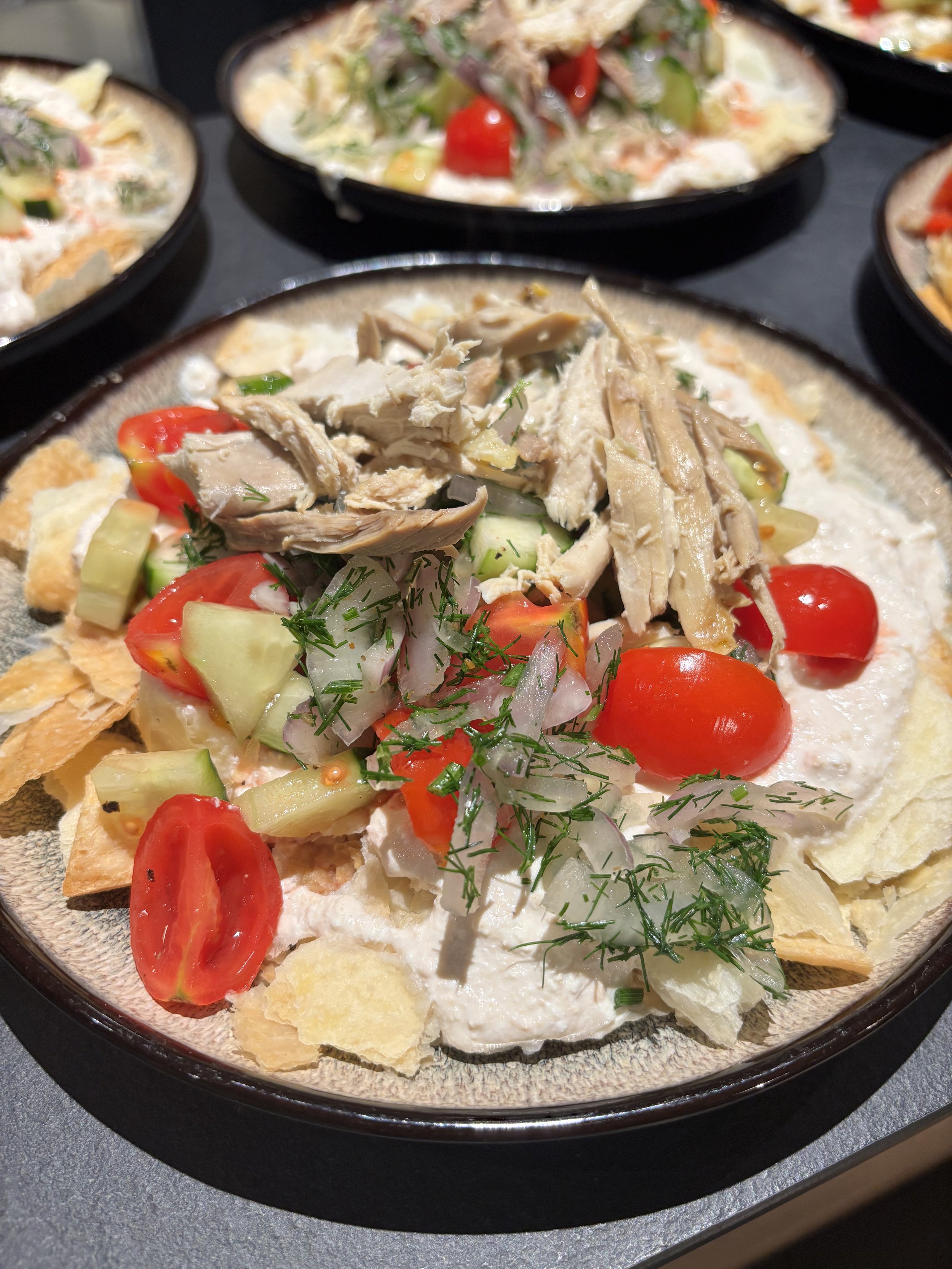 Sfoglie croccanti con crema di qurt, verdure e tenera carne di faraona.